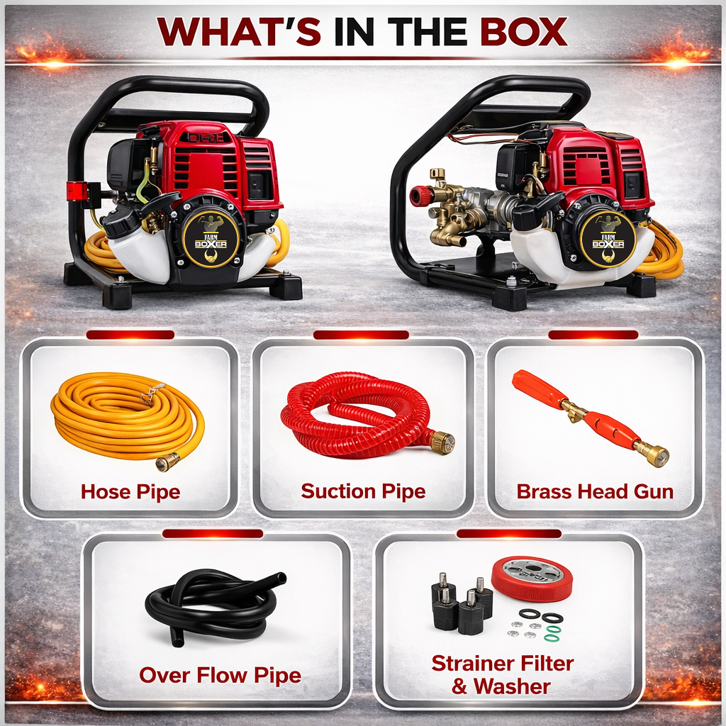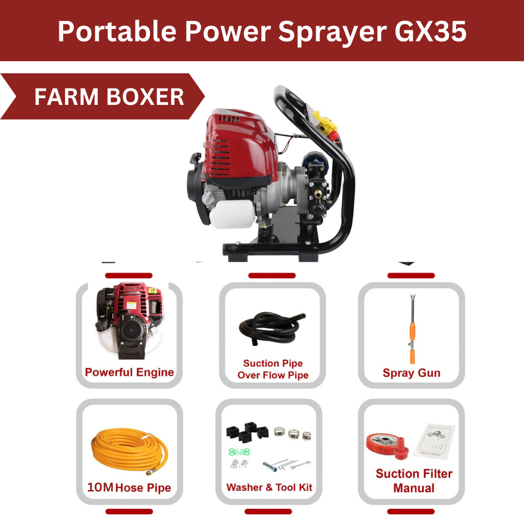 portable Power sprayer is your ideal machine for spraying large volumes of professional-quality chemicals intended for farming operations. Since this sprayer comes with a 50-meter long hose & Balwaan 1-foot spray gun, you will also be able to reach long distances while spraying. you can also use this sprayer for mango garden/factory shed cleaning/car washing. Capable of very high pressure, supplied with forced air-cooled 2 stroke petrol engine, equipped with brass metal pump. Engine fixed with Easy recoil starter, Less fuel consumption. Economic for spraying pesticides, Cleaning output for easy and quick cleaning. Portable Sprayers are conventional and the most popular equipment used worldwide. They are ideal for spraying insecticides, pesticides, fungicides, herbicides, etc. in field areas to protect the crop from pest attacks. These Sprayers have multiple applications and are widely used in agriculture, horticulture, sericulture, plantations, forestry, gardens, etc.