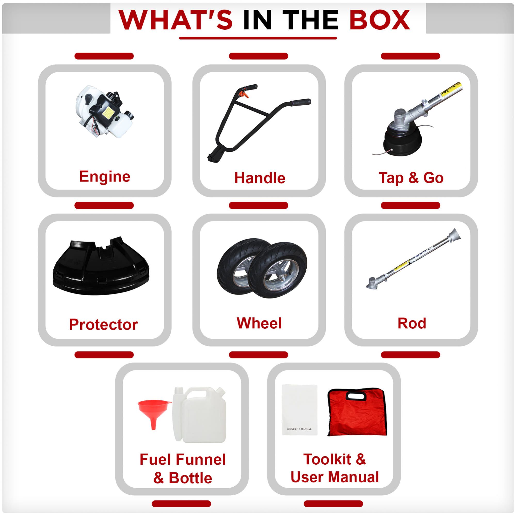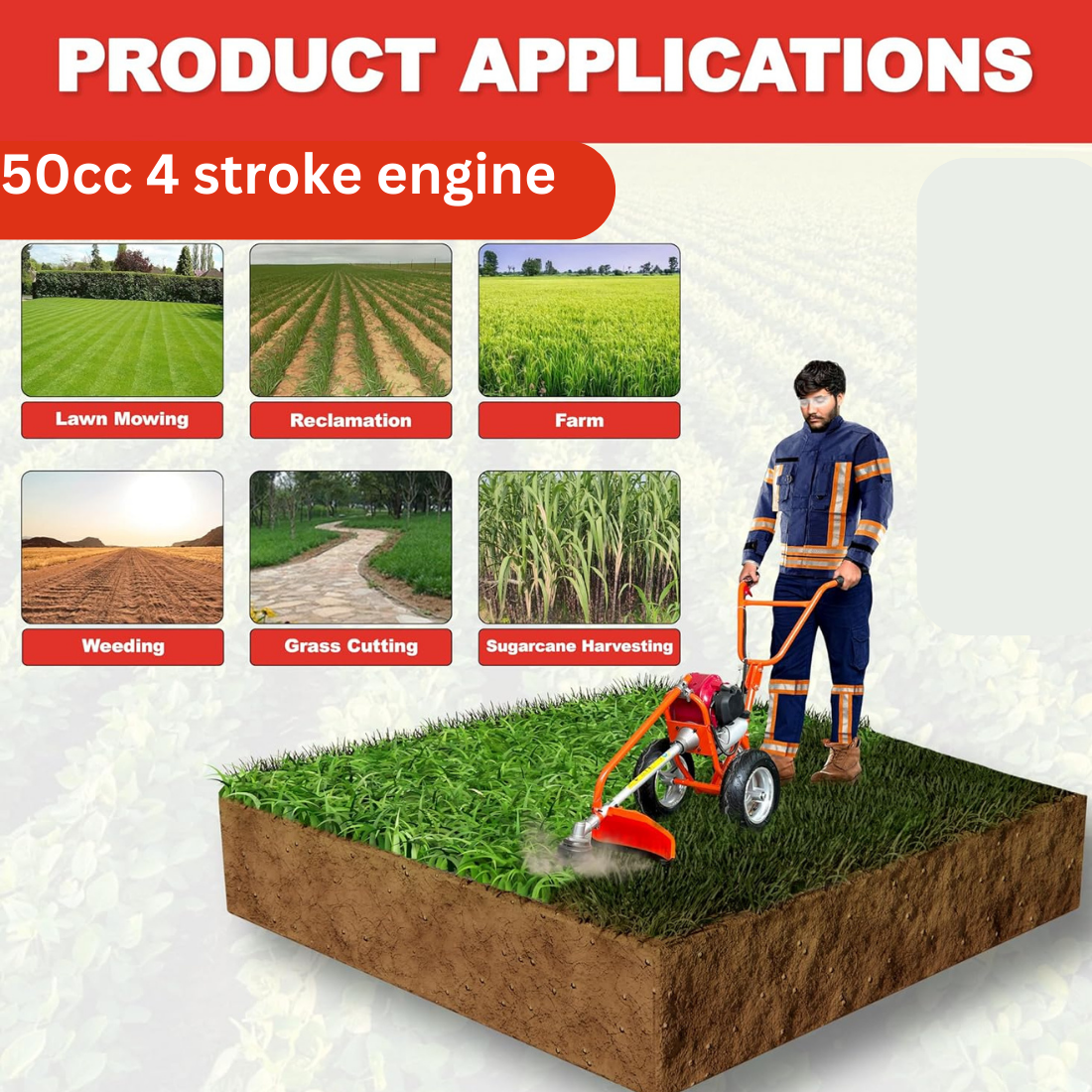 Trolley Brush cutter/Mini Tiller/Cultivator/Rotary/Weeder quickly breaks up the dirt & hard clay soil to prepare it for planting. It has dual rotary tines that dig in large or narrow spaces to flip soil thoroughly. An innovative transmission design and powerful 2-stroke petrol engine make this small tiller deliver heavy-duty performance. A multipurpose machine to make rototilling & weeding fast, easy & fun. One Machine, Multiple Usages Versatile – weeding, mixing & aerating Forged tines for superior tilling and long life. Ergonomic handle design with overhead controls. We are offering the best and most perfect quality assortment of Mini Tiller. These tillers are highly appreciated for agriculture and gardening purposes. Starts with a recoil starter. tiller machine is basically used to do tilling operations and for grass cutting in the field. It runs on petrol and has a powerful engine of 52 cc. Wheels are provided below to facilitate easy movement of the machine. Tilling depth is 5-6 inches and the working width is up to 16 inches for better soil aeration. Comes with heavy-duty blades to ensure effective tilling inside the soil.