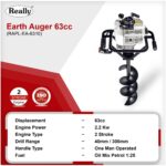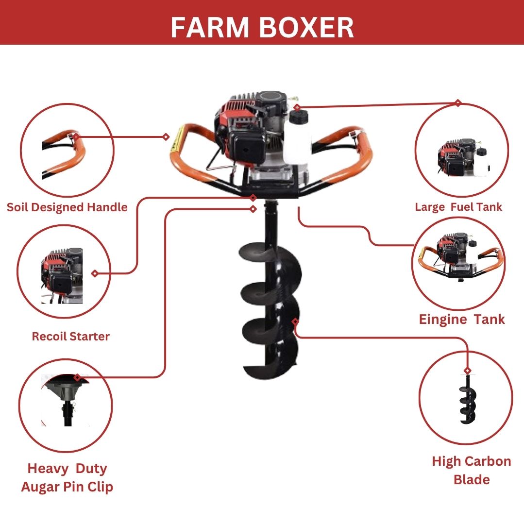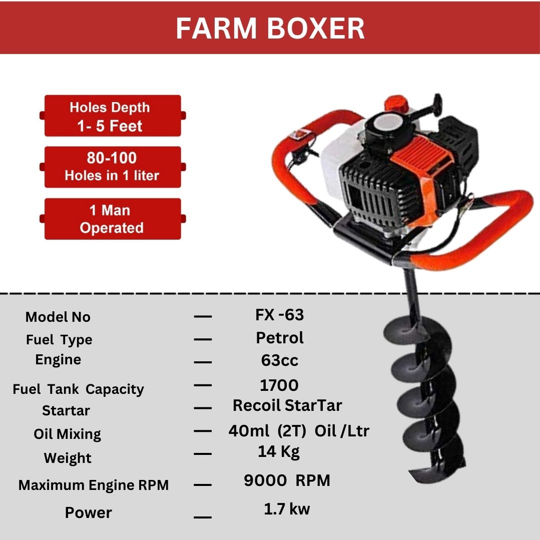 earth auger EA-6310 is used for digging holes in the soil for planting, construction, and other areas.Recommended for all types of land, Soft, medium, and hard. Continuously can be used for 6-8 hours. EA-6310 earth auger is suitable for drilling type of operation on grounds, farms, nurseries, and greenhouses.Use for agriculture purposes for drilling in farms for banana plantations, and vegetable crops.It is also used for Agriculture Institutes, horticulture plantations, Highway authorities, Contractors for fencing, land soil sampling, etc.It is much easier to dig the soil with this machine and the process takes less time.This machine is powered with a 63 cc powerful petrol engine of 2 stroke type.Different sizes of bits can be fitted with this machine so that we can dig holes of different depths. Earth Auger can dig holes in the depth of around 3-4 feet and max-width of around 1 foot and can easily dig around 80-100 holes in 1 liter of petrol on 100% human working capacity.For any queries/ Installation/ Virtual Training/Accessories/Spare parts. Contact 0141-6727778.WE STRONGLY RECOMMEND TRAINING BEFORE USING EQUIPMENT.
